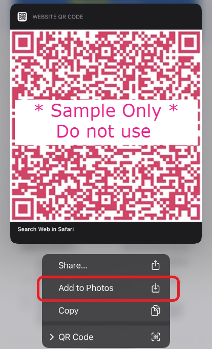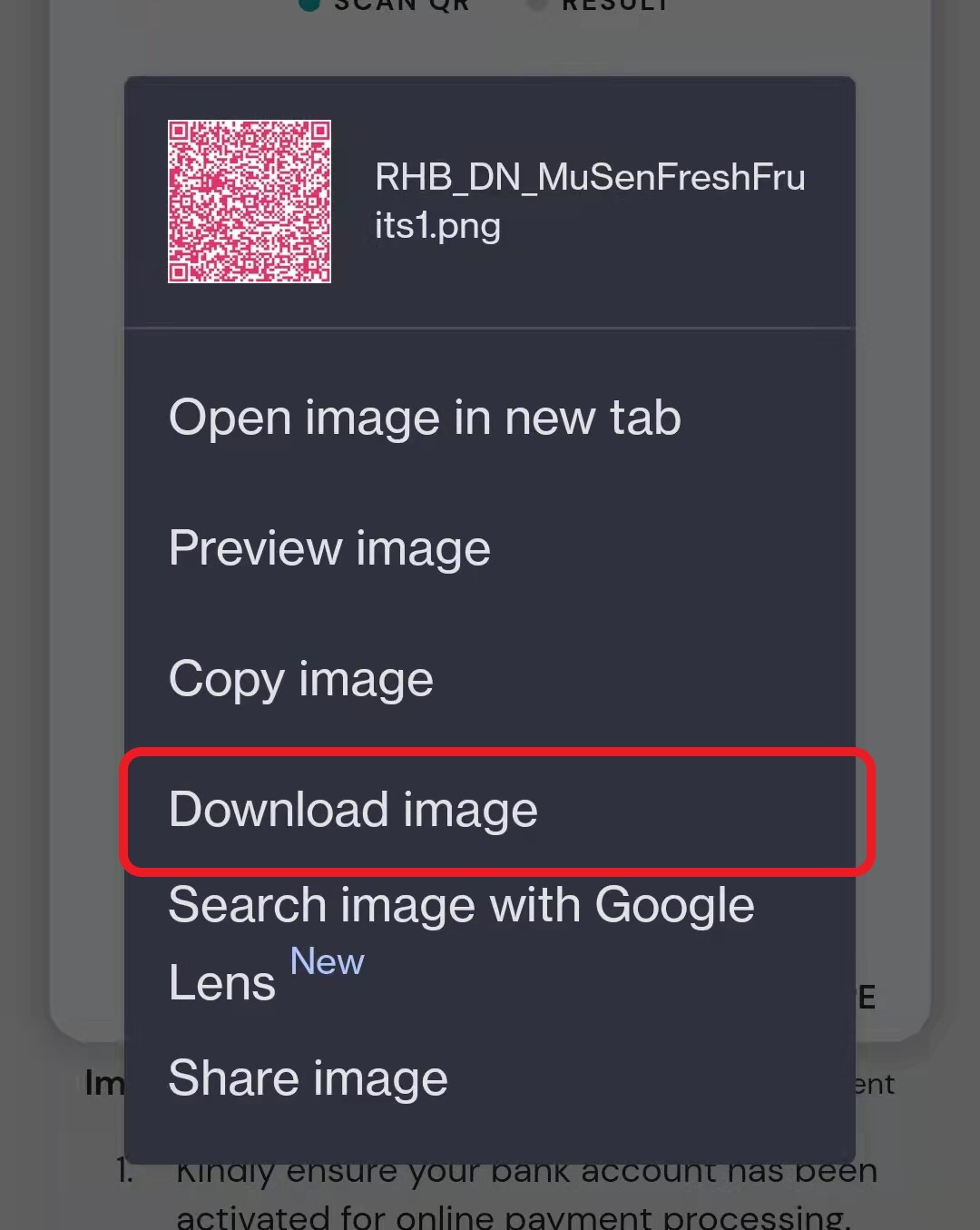 1. Long press the QR Code in payment page 2. Select 'Add to Photos' for Apple user or 'Download image' for Android user